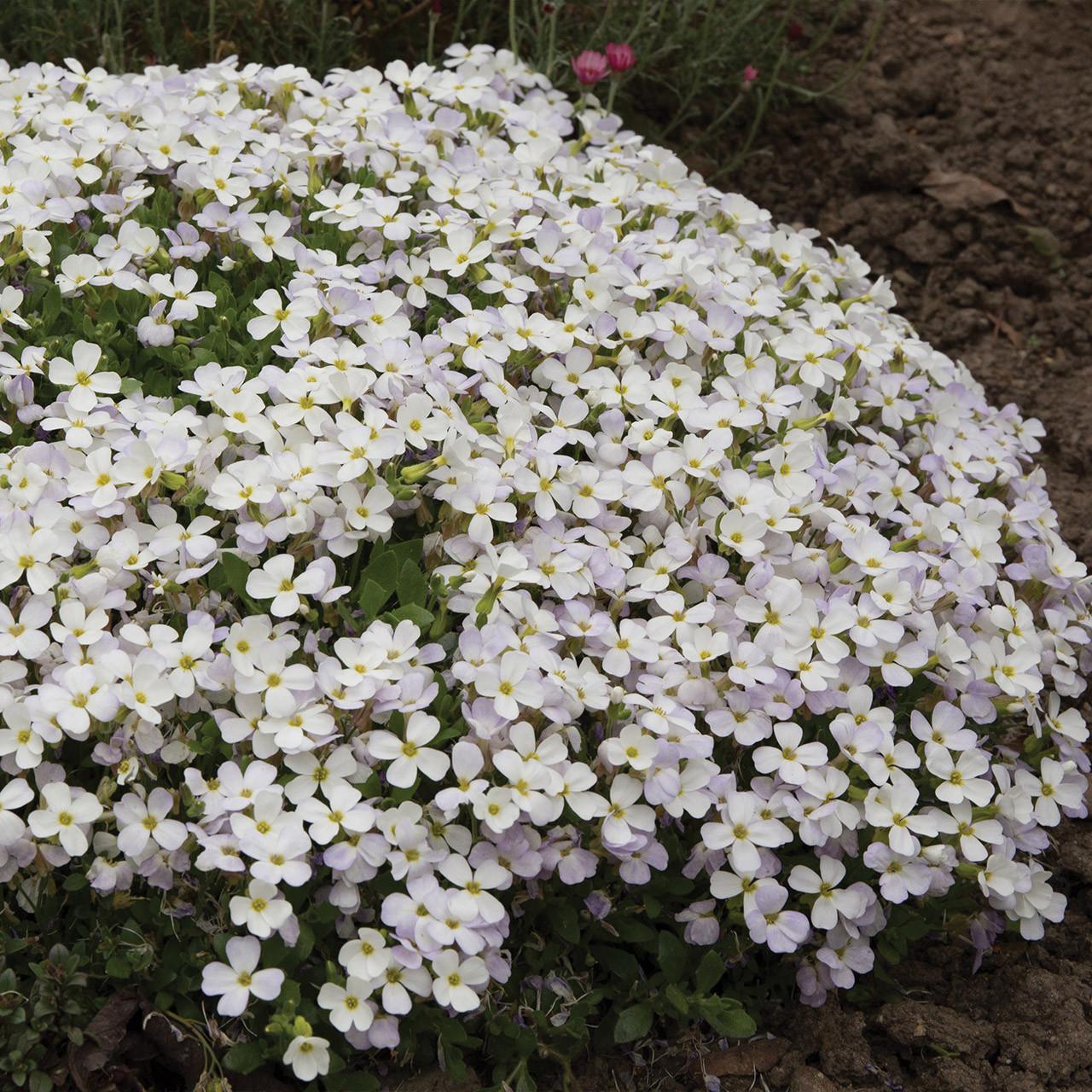 Az Aubrieta gracilis 'Florado White' - Pázsitviola 10-15 cm magas, apró, fehér virágai paplanként borítják be a talajt áprilistól májusig. Kompakt növekedésű, örökzöld évelő.