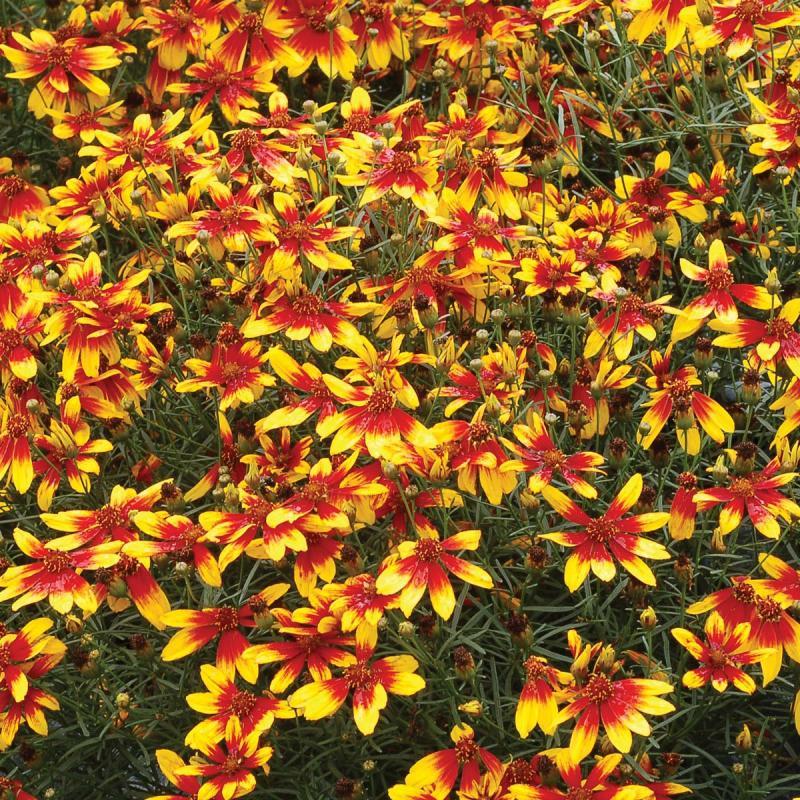 A Coreopsis verticillata 'Lightning bug' - Menyecskeszem 60-90 cm magas, júniustól szeptemberignyílnak piros-sárga cirmos virágai. Évelő dísznövény, jól bokrosodik.