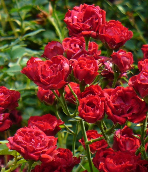 Rosa 'Red Cascade' - Talajtakaró rózsa kb 1,5 m magasra nő, vagy talajtakaróként beborítja a talajt. Vörös, félig telt virágú miniatűr rózsa. A nyár végéig folyamatosan hozza kisebb csomókban nyíló virágait. A virágok átmérője 3 cm. Lombja fényes zöld.