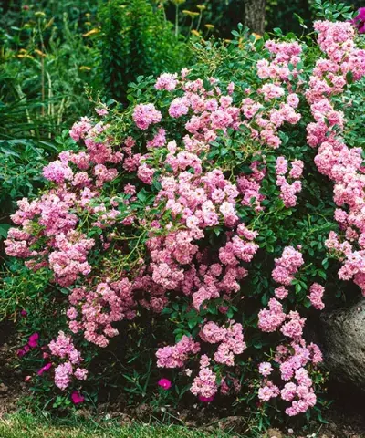 A Rosa 'The Fairy Pink' - Talajtakaró rózsa kb 50 cm magasra nő, nagyon jó talajtakaró. Rózsaszín, telt virágú rózsa. A nyár elejétől a fagyokig folyamatosan hozza kisebb csomókban nyíló virágait. Apró, sötétzöld levelei vannak.