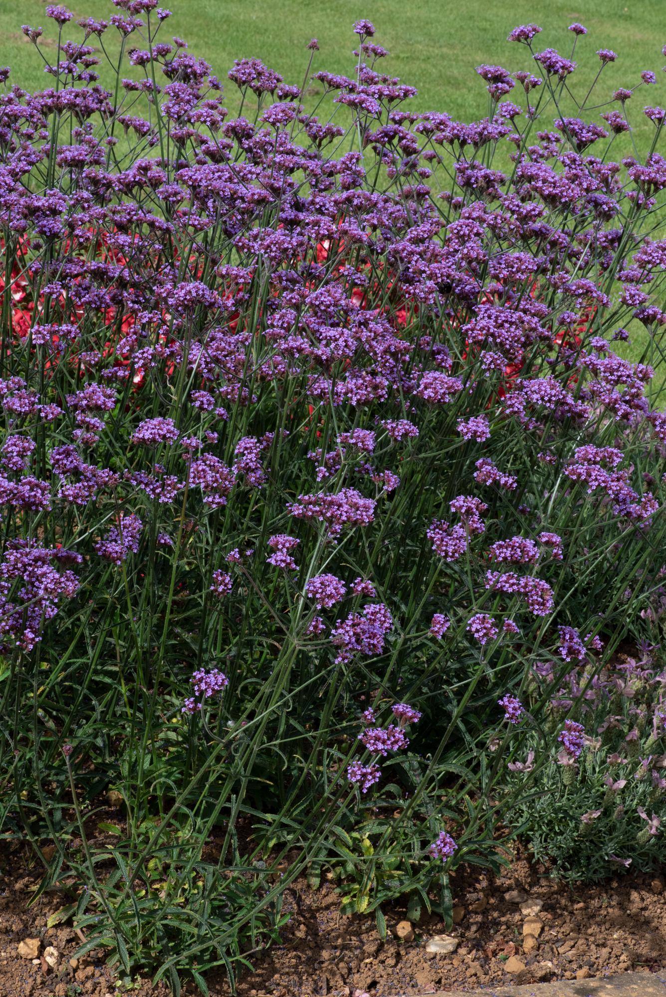 A Verbena bonariensis 'Bonnie Blue' - Ernyős verbéna Dél Amerika trópusairól származik, inkább réteken él. Korábban egynyárina tekintették, de az elmúlt enyhe teleken áttelen, magjait is elszórja, így magról is kikel. Légies megjelenésű évelő növény, felálló szára végén jelennek meg csomókban lilás virágai. Nyártól virágzik, pillangók, rovarok kedvelik.